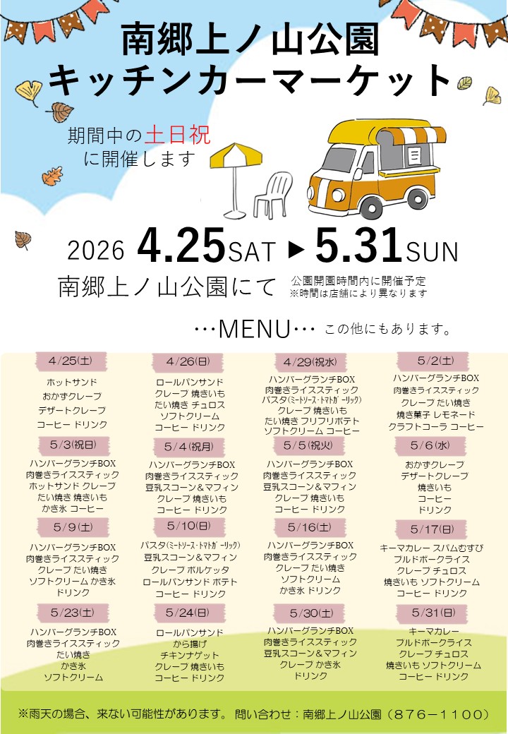 【4月25日~5月31日土日祝開催】南郷上ノ山公園にキッチンカーがやってきます!